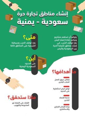 كشفت تقارير إقتصادية عن توجه سعودي- يمني لإنشاء مناطق تجارية حرة بين البلدين، خاصة في منطقتي نجران وجازان الحدوديتين مع اليمن ضمن مشاريع إعادة إعمار اليمن.